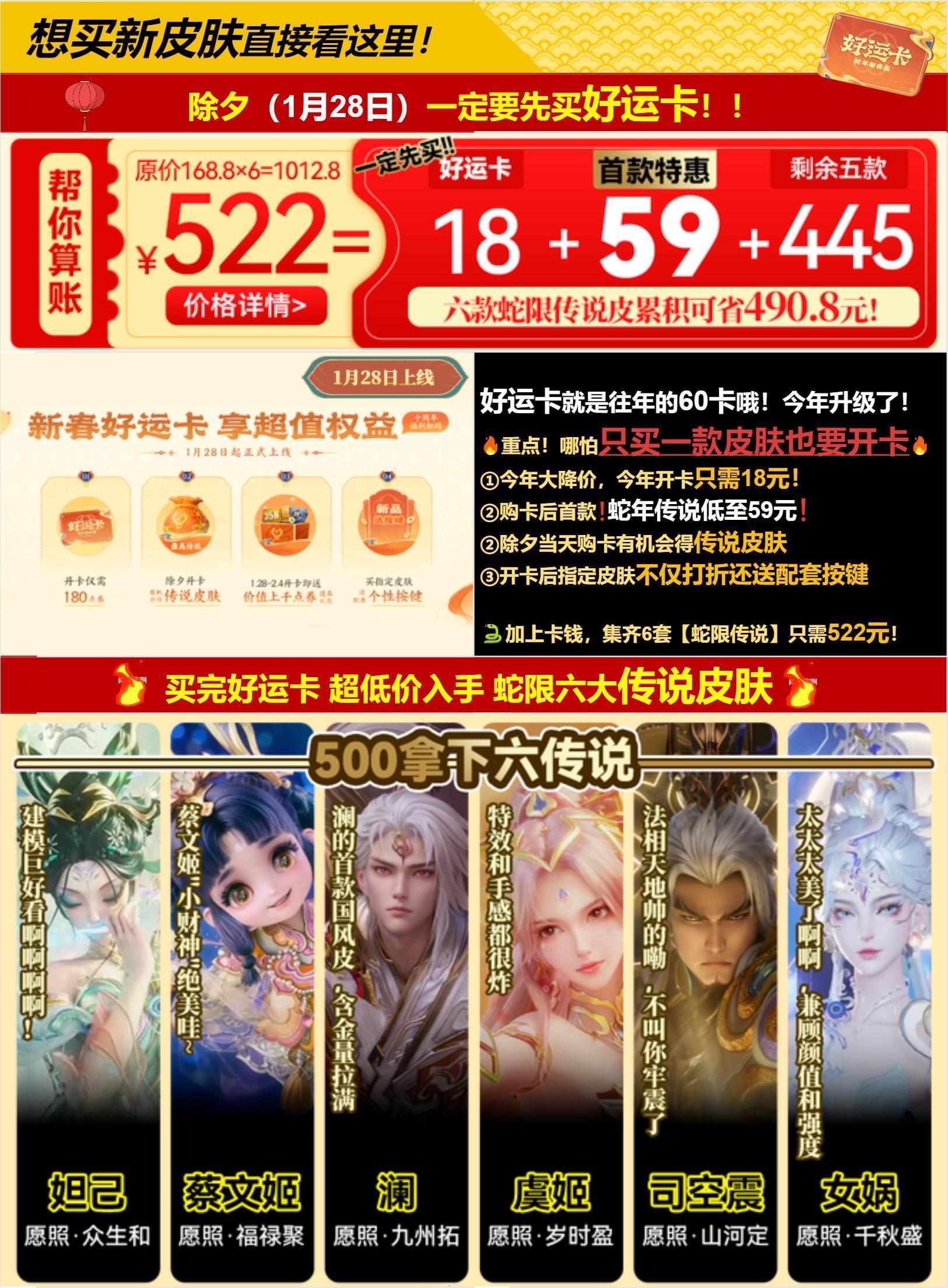 除夕1月28日必入好运卡,6套年限皮肤到手价522,哪怕只买一款皮肤也要开卡,开卡不止年限皮肤打折,购买指定皮肤还送配套按键,另外除夕当天开卡还有机会得到传说皮肤。