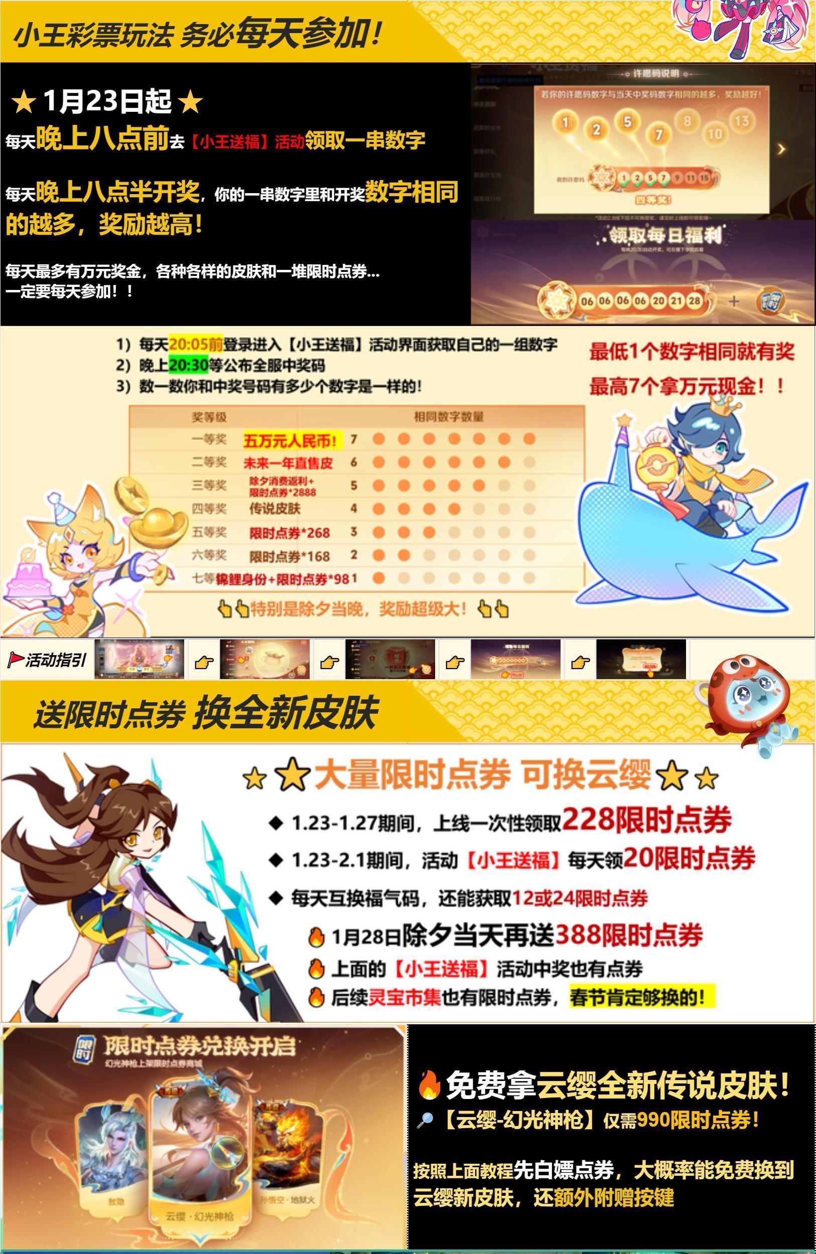 1月23日-27日,一次性领取228限时点券,1月28日除夕当天领取388限时点券,参加送福活动每天领20点券,后续灵宝市集也会有限时点券,总而言之攒够990限时点券并非难事,免费兑换云缨全新传说皮肤以及按键,咱们都可以!
